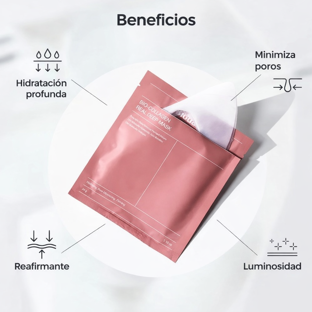 Descubre el poder de la hidratación profunda con Bio-Collagen Real Deep mask, una mascarilla facial intensiva formulada con colágeno de bajo peso molecular que ayuda a mejorar la elasticidad, firmeza y luminosidad de la piel desde la primera aplización.